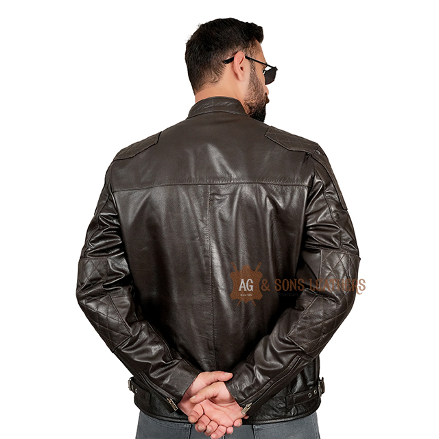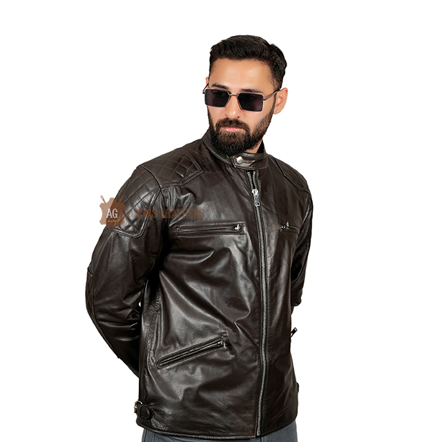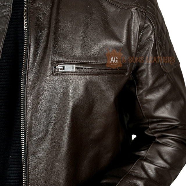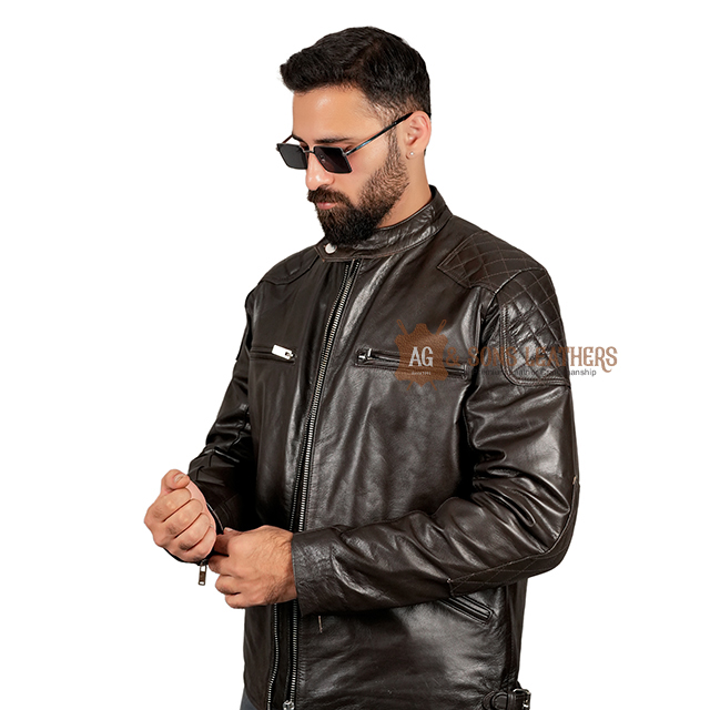 This dark brown biker-style leather jacket is the perfect blend of rugged charm and contemporary sophistication. Its sleek design features quilted shoulder detailing and multiple zippered pockets, providing both style and utility. The stand-up collar with a snap button closure adds a modern edge, while the slim fit and premium leather finish ensure a sharp, tailored look. Designed for the urban adventurer, this jacket brings together durability and fashion-forward appeal, making it a versatile piece for casual rides or night outs. Its timeless design radiates confidence and understated luxury.