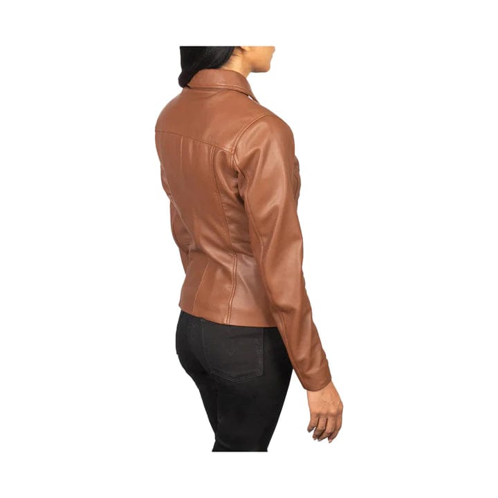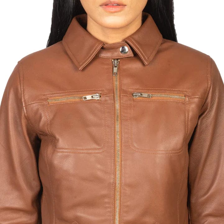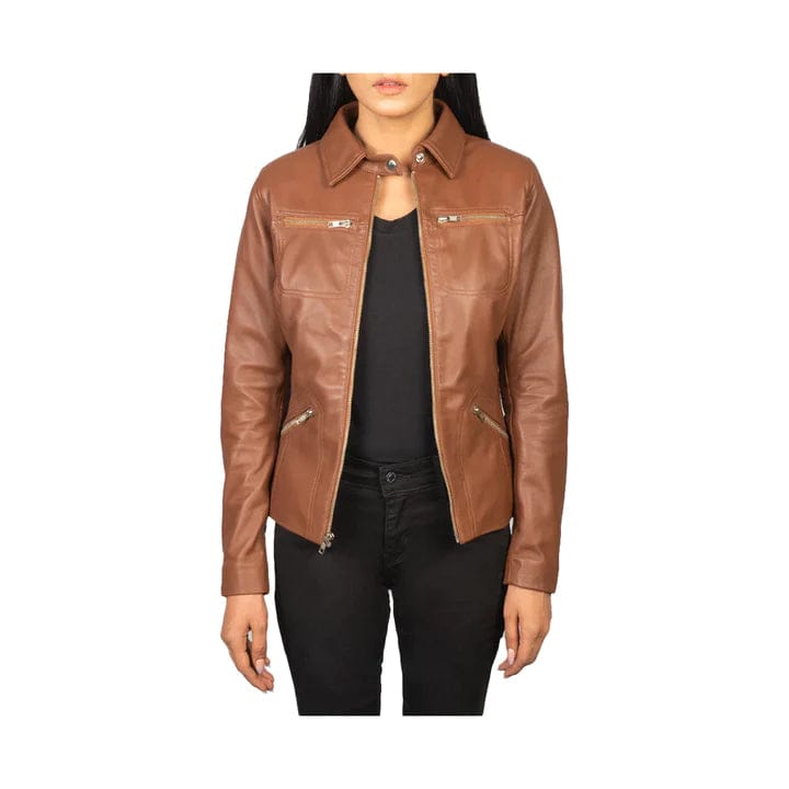 Introducing the Women’s Tan Brown Leather Jacket with Shirt Collar Style – a masterpiece blending style and sophistication. Expertly crafted from genuine sheepskin leather with a semi-aniline finish, this jacket radiates timeless allure and intrigue.